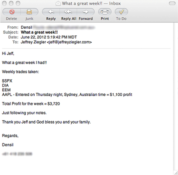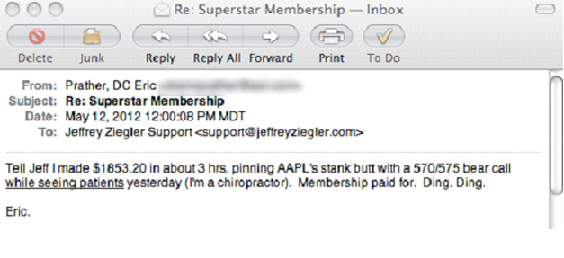 I'm retired now from working as an investment specialist in the brokerage/securities industry for over 30 years. I wish I had found my way to jeffreyziegler.com much earlier, however, for it was only after subscribing to your instruction and services that I truly began to understand the pleasure (yes, pleasure) of successfully supplementing my retirement income through options trading. I also learned that there were a lot of gaps and loose ends in my knowledge and experience. I really appreciate your help in filling those gaps and tying those loose ends.