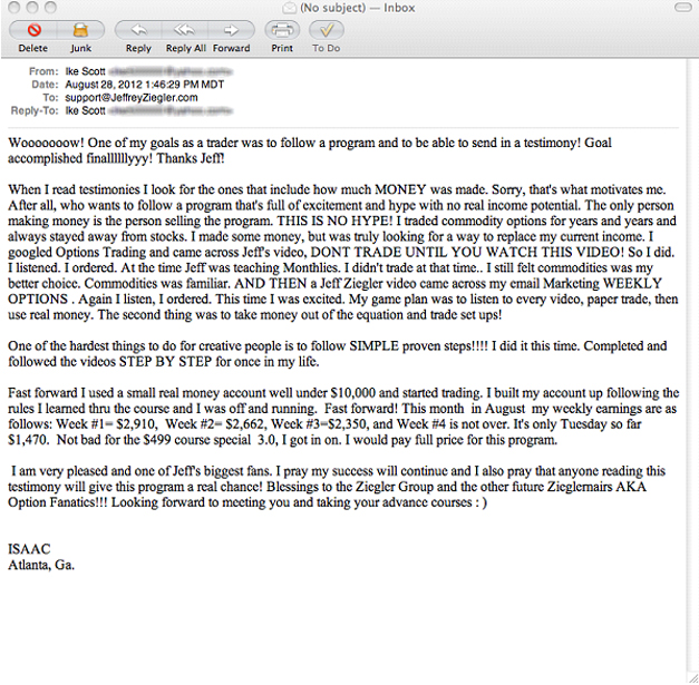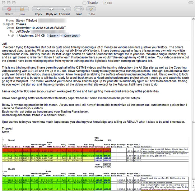 “From my brief experience with Mr. Jeff Ziegler and his credit spread trading course i can easily recommend it for both the soundness of the strategy and the great ongoing training and support offered by Mr. Ziegler.”